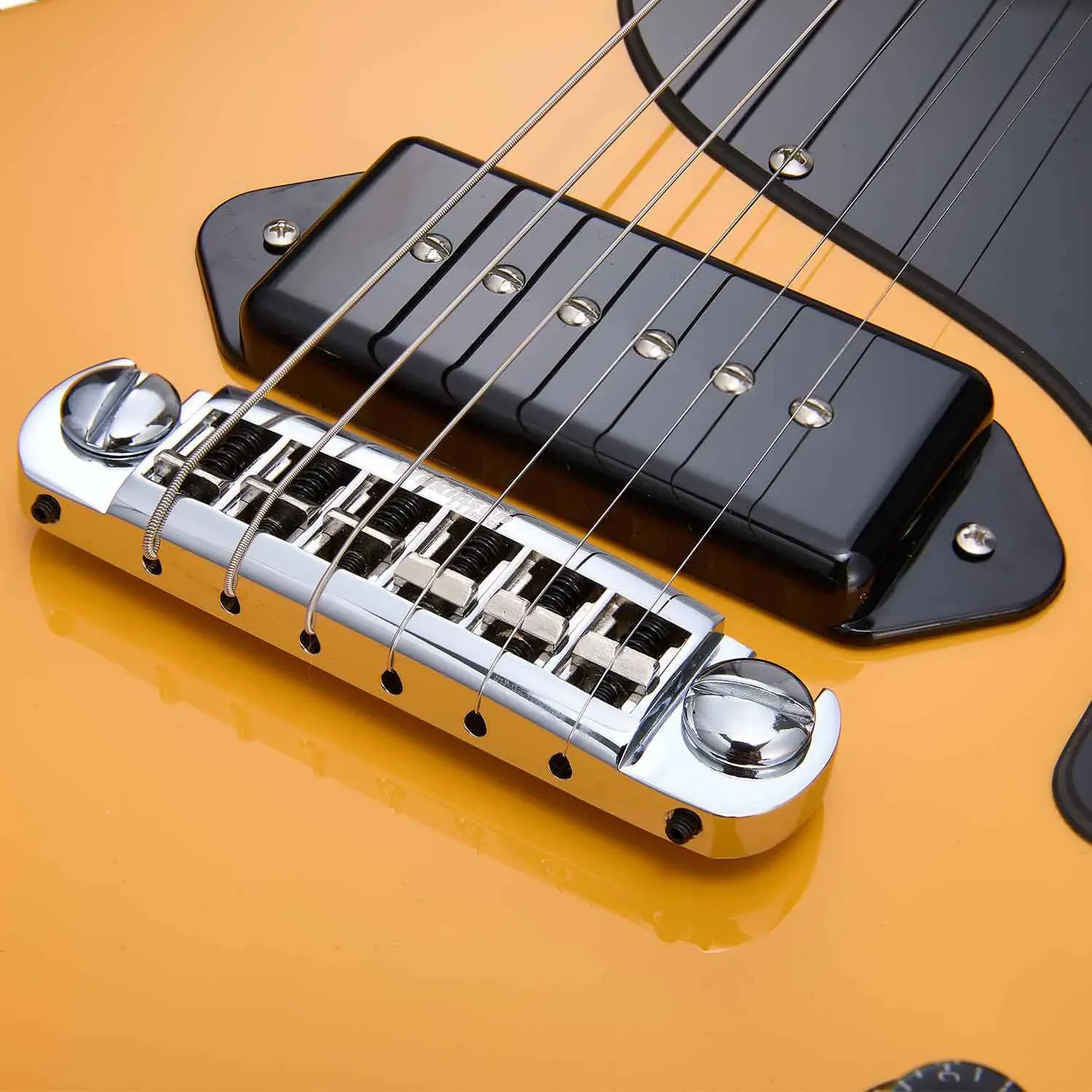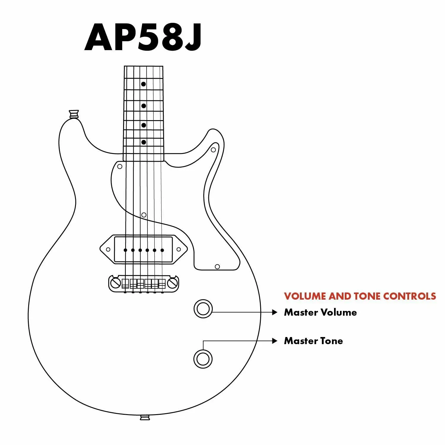 The AP54J also features a Wilkinson wrap-around bridge, with adjustable bridge posts and saddles to lock in your intonation, and the 43mm Bone nut and Chrome machine heads will keep you in tune through any Rolling Stones covers set! With a single dog-ear P90 in the bridge position, the AP58J has got some serious bite, and we have used premium-grade hardware to ensure the tone and volume controls are responsive to the touch.