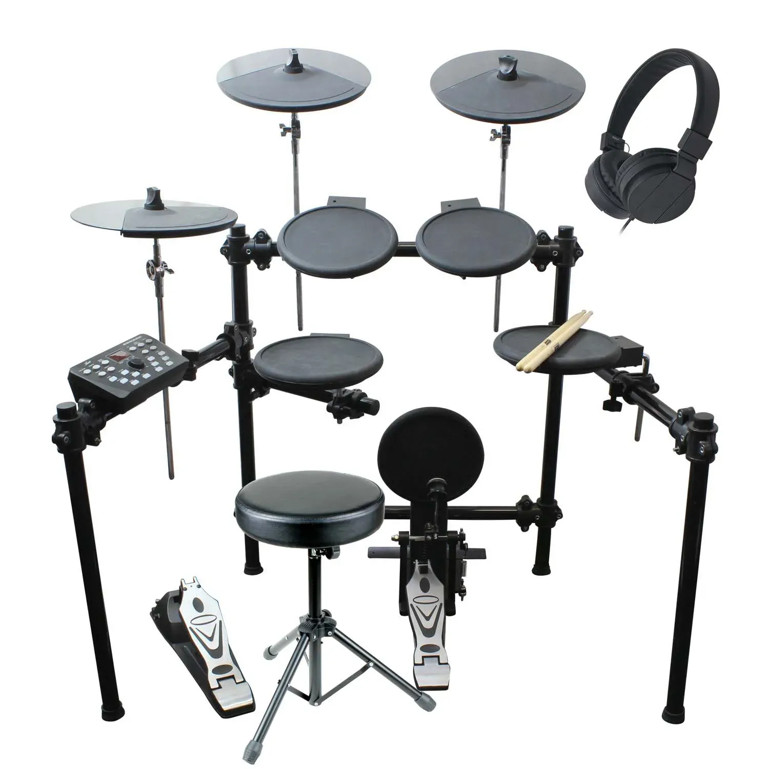 This is an 8 piece drum kit. It comes with everything you need to play straight out of the box, including a pair of drum sticks, 4 drum pads, 3 cymbal pads,1 hi-hat control pedal,1 kick trigger and all Hardware, including a kick pedal and a Stool! It even comes with a pair of sticks and headphones so you'll rock out the minute you pull it out of the box.