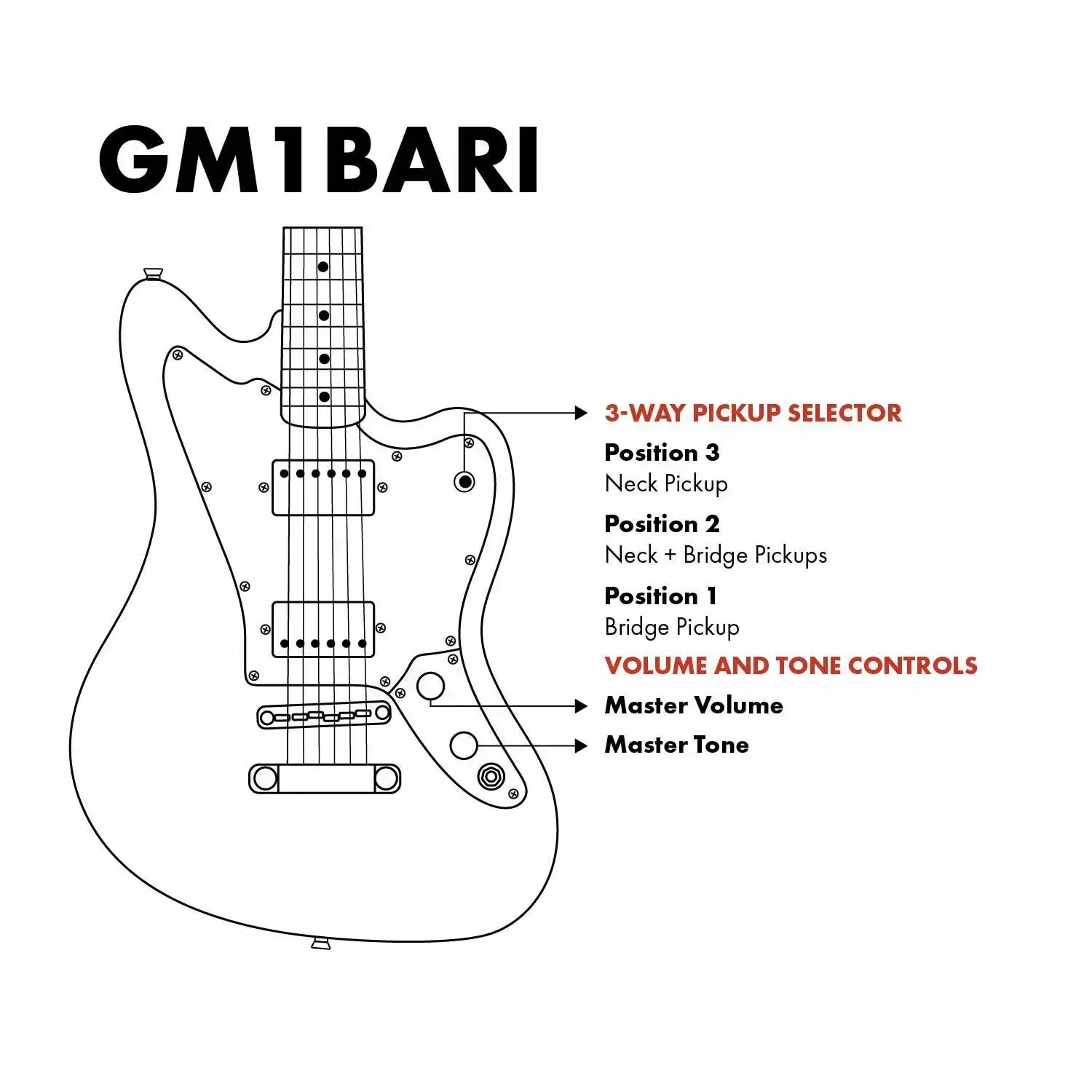 The GM1BARI features a Chrome Stop-Bar Tailpiece, and the Bullbuckers are chrome-covered with the vintage-style machine heads completing the look. The longer scale length and sturdy construction make these guitars perfect for lower tunings, and Baritones are very popular for heavier genres. Plug in your favourite chorus pedal for those classic Robert Smith tones or crank your amp to max if you’re more of a Petrucci fan, the GM1BARI covers a lot of ground!