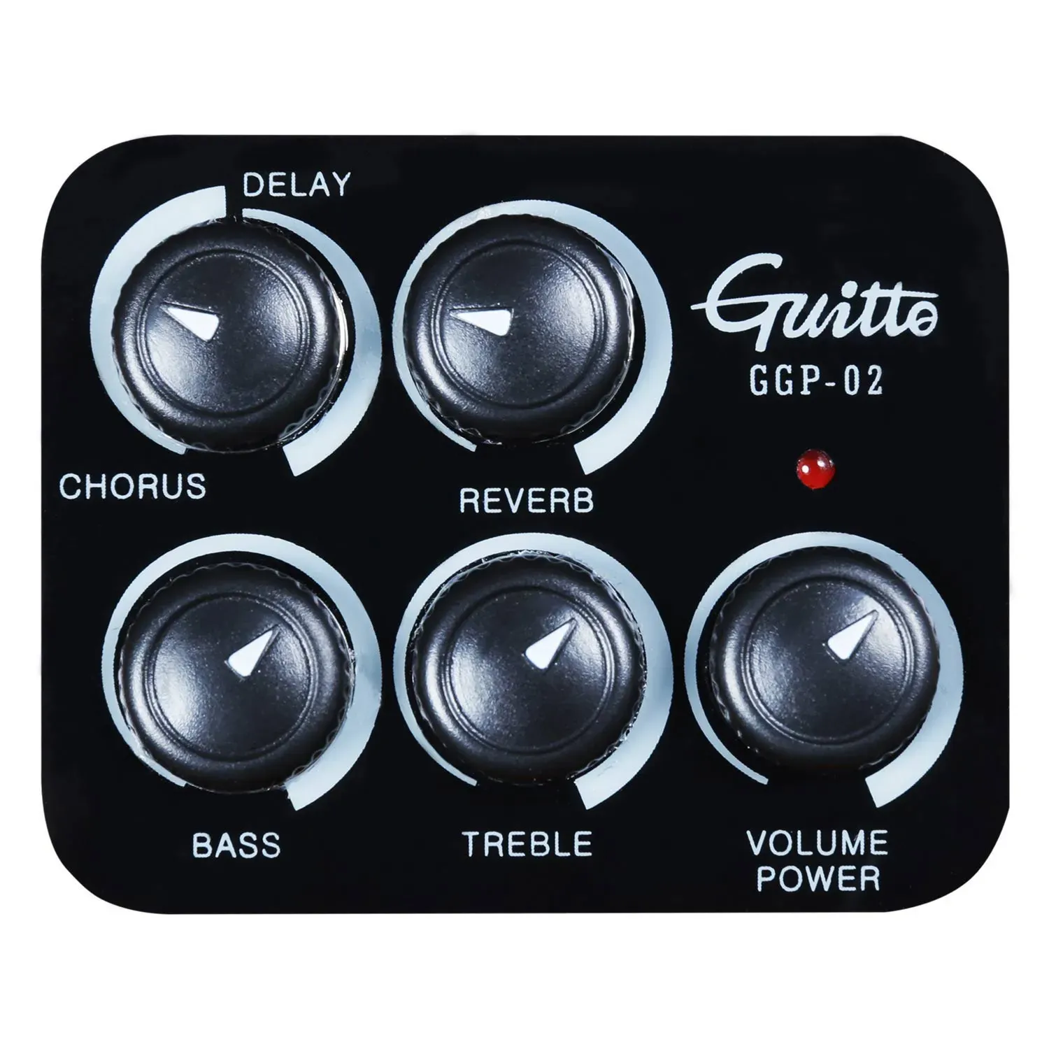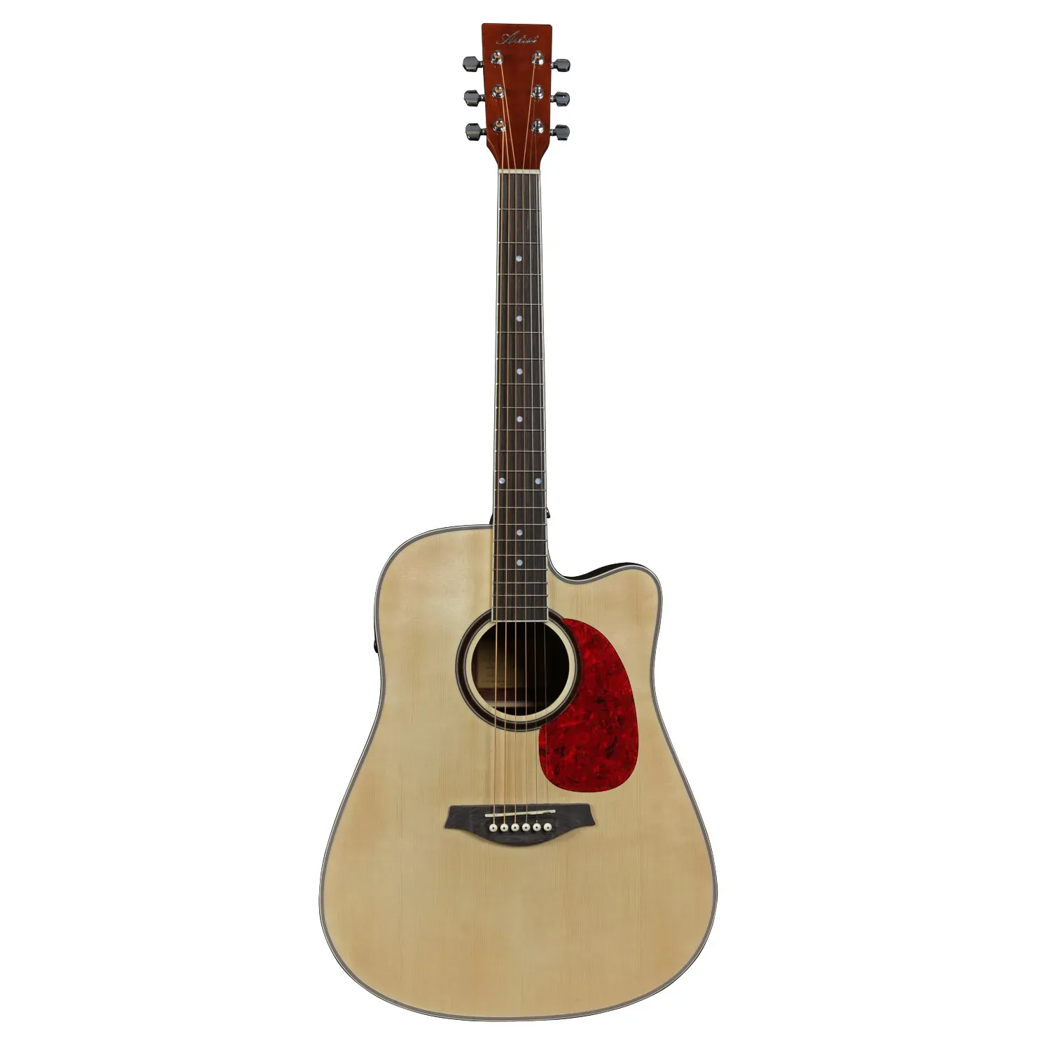 The LSPFXNT is a dreadnought bodied acoustic guitar that comes with a built-in speaker and effects module. Based on the Artist LSPCEQ, the guitar features a cutaway and built-in pickup. The Guitto GGP-02 effects module, paired with a speaker/inbuilt vibration unit, features Chorus, Reverb, and Delay that can be used without the need for an amplifier, as well as a 2-Band EQ and master volume control.