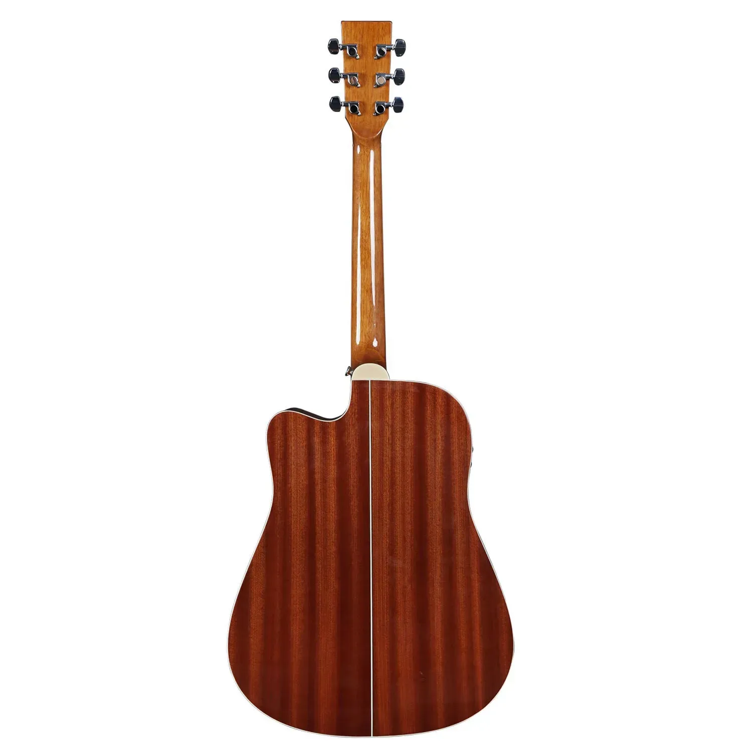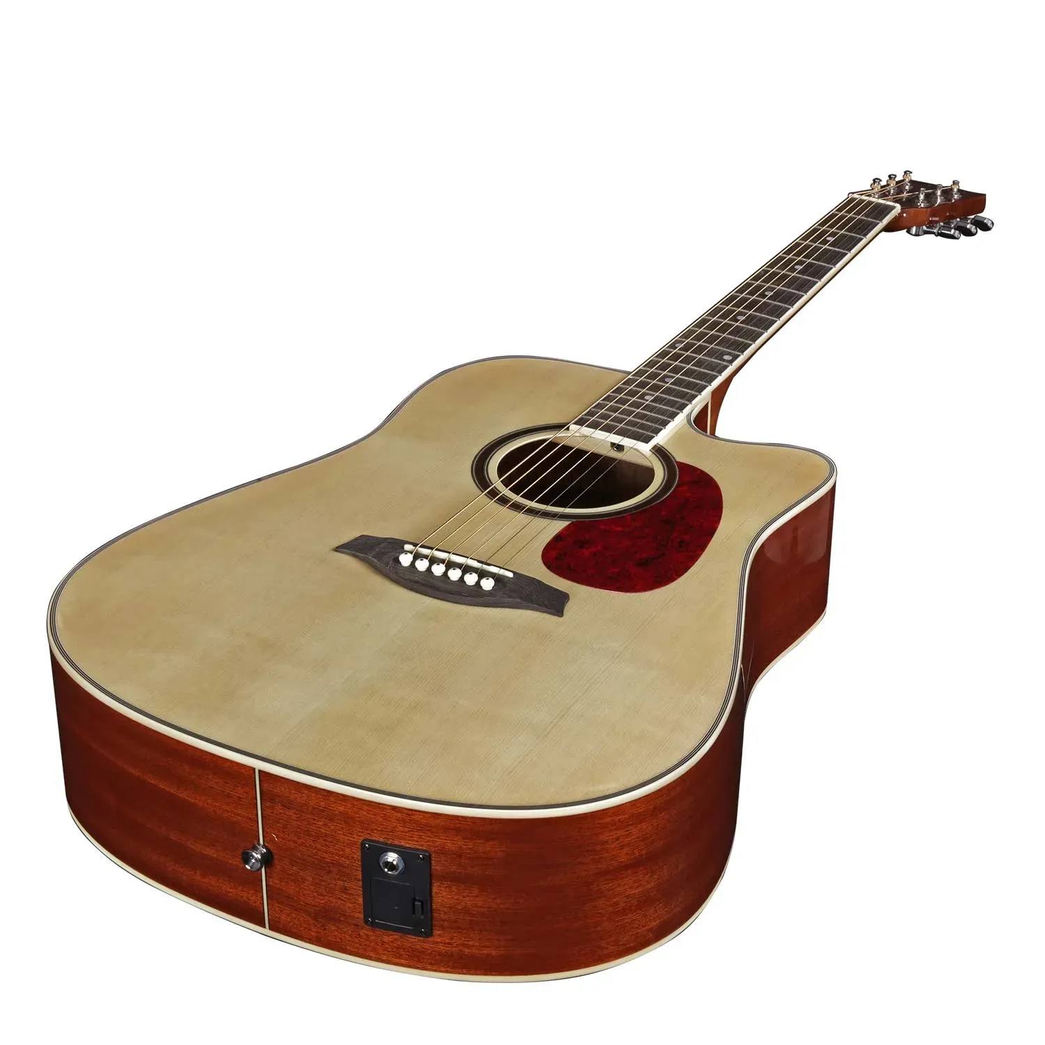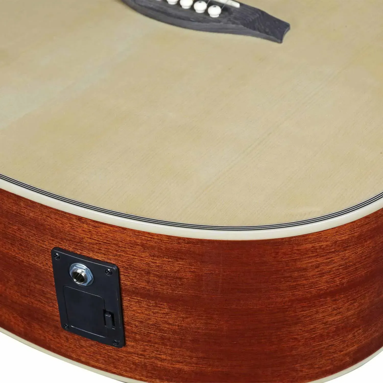 The guitar features a laminated spruce top and laminated Sapele back and sides. The neck is made from Okumen with an Eco-Rosewood fingerboard and features a truss rod.