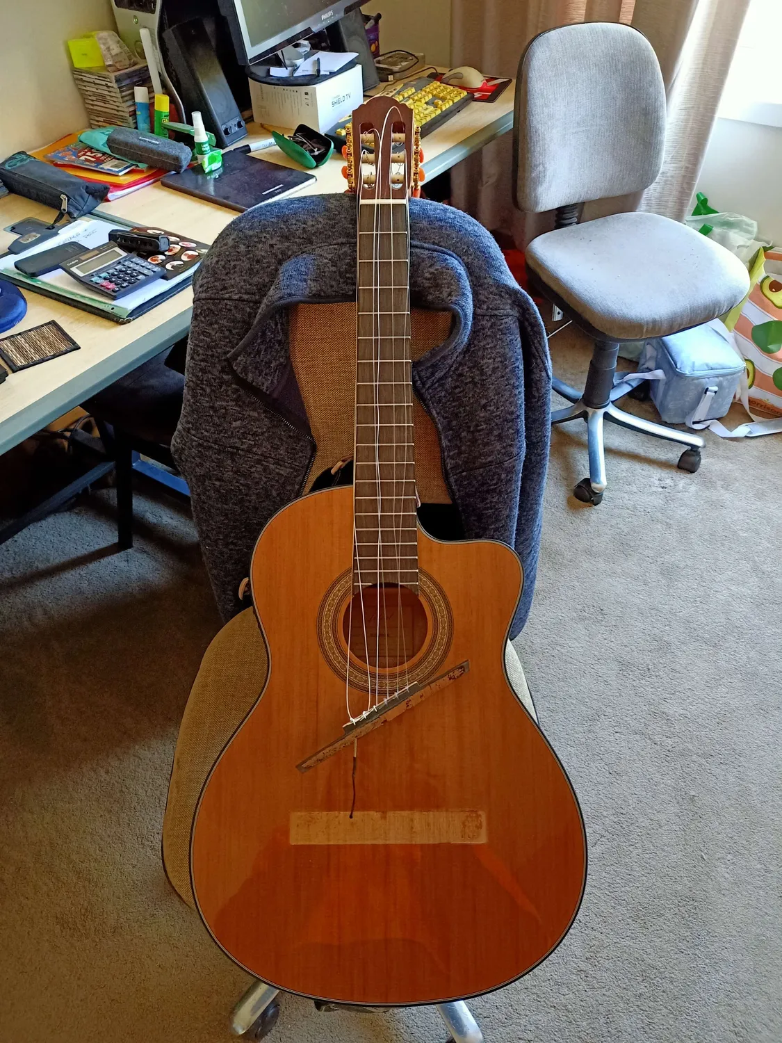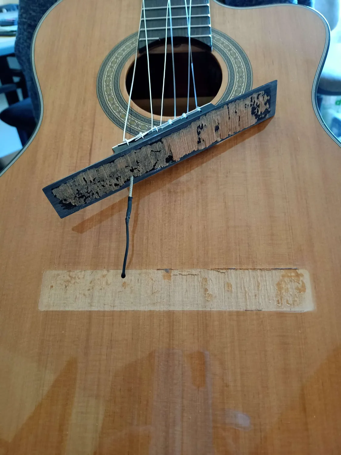 The bridge lifted off from the body. The guitar would need to be repaired by a guitar tech. Please see images.