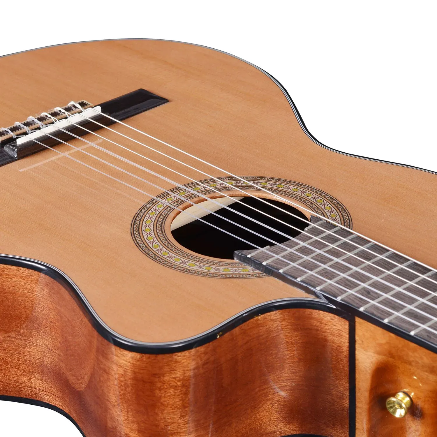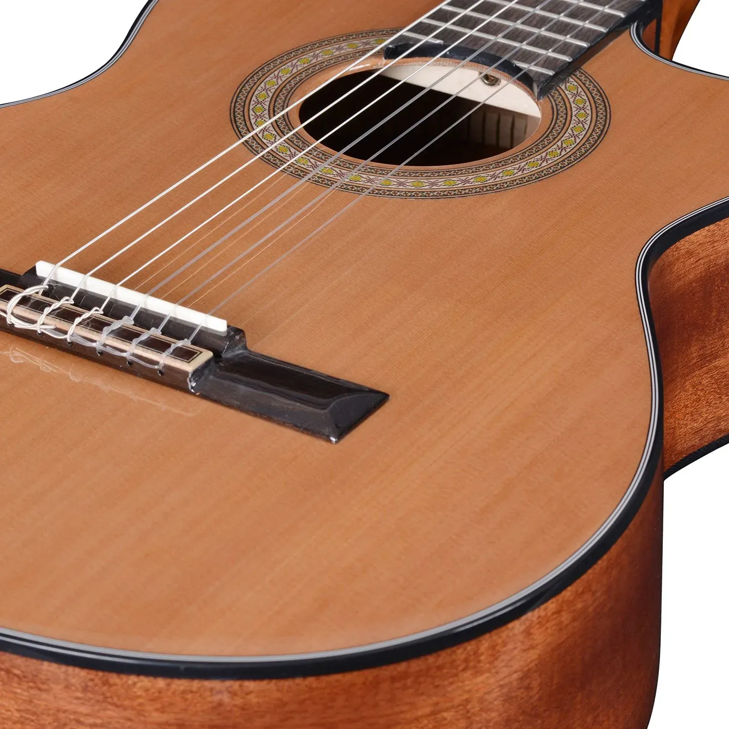 As with all our solid top guitars we use a bone nut and saddle, the hardness of the bone allows great tone and sustain, the typical plastic nuts are quite soft and have the effect of deadening the sound.