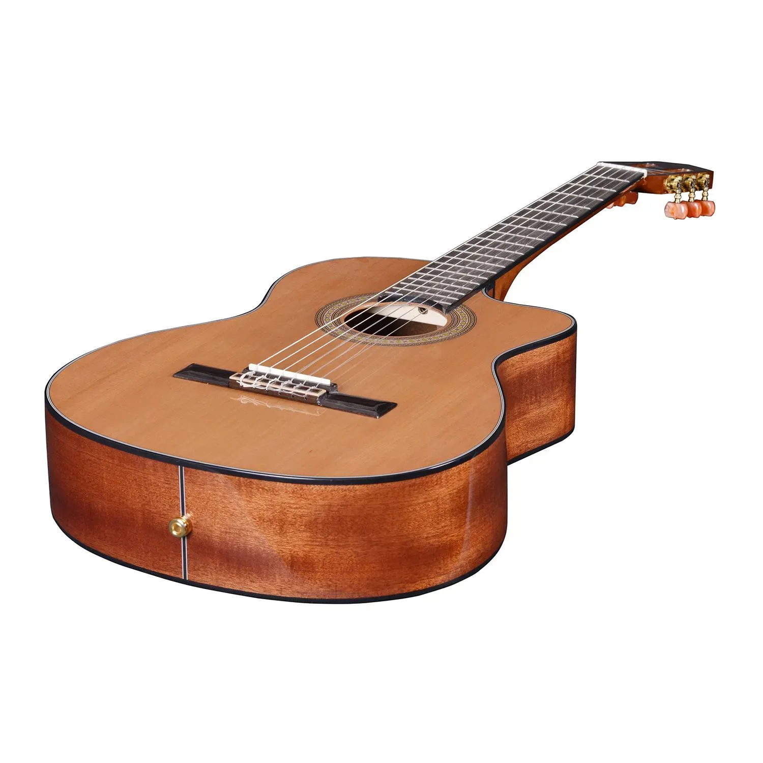 This is one of my personal favourites. The solid cedar top gives it a really warm sound and we have added a Spanish heel. For those of you that don't know, the Spanish heel is a much more difficult way of making a guitar but it greatly improves the sustain. On standard Classical guitars they often use dowels to attach the neck and a lot of tone can be lost through this joint.