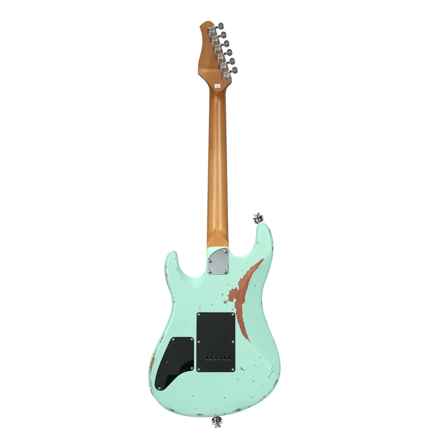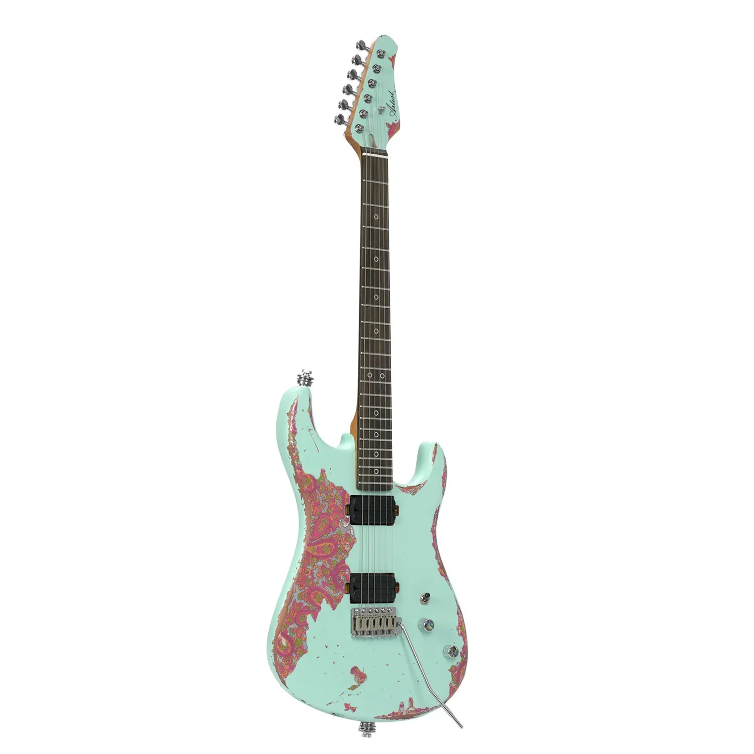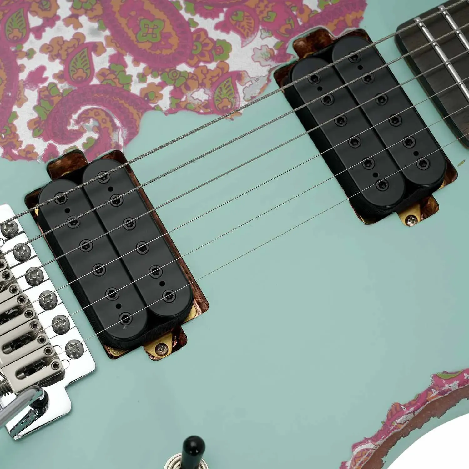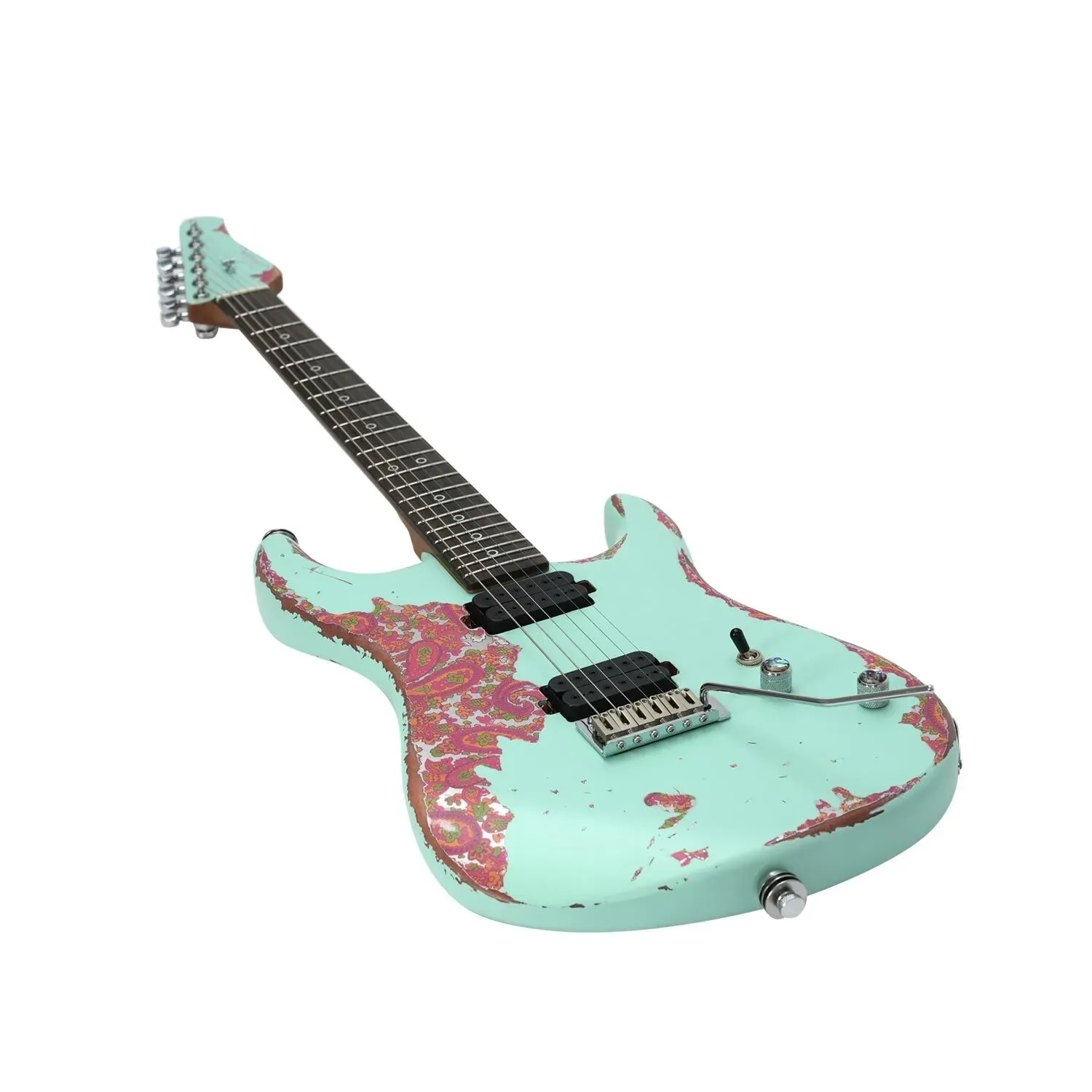 The latest in our higher-end offerings for the New Year, the Skyler is a handcrafted, dual-humbucking riff machine with the specs to match! Featuring a gorgeous quarter-sawn roasted maple neck topped with a dark slab of genuine rosewood, a bone nut, and high-grade locking tuners, the Skyler is both functionally and aesthetically elegant. With an aged nitrocellulose surf green finish over classic pink paisley, this particular Skyler is sure to turn heads. Having tested untold amounts of pickup options, we settled on a pair of high-end, hand-made humbuckers wound by the Laohao workshop, a small team producing low-quantity batches of custom pickups to a frankly unbelievable standard.