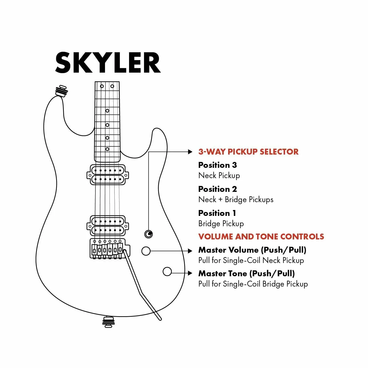 With a clear, bell-like high end and throaty mid-range, they have plenty of bite, and compress beautifully to produce rich harmonic distortion tones when pushed, while the push/pull pots allow for more strat-like single-coil tones when needed! Each Artist Skyler features copper shielding to ensure ground noise is kept to an absolute minimum, while a wheeled string tree and locking strap buttons take care of the little details for you. From the moment it is born on the workbench to the moment of unboxing, the Artist Skyler is raring to be played!