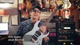 The new AG45 has a new slim design neck which has been improved and is great for players that want to play fast. It has a humbucker/single/humbucker configuration and decent pickups. This guitar is a great addition to your guitar line-up or a great first start. You won't believe the quality for this low price! We also sell these as an amp package.