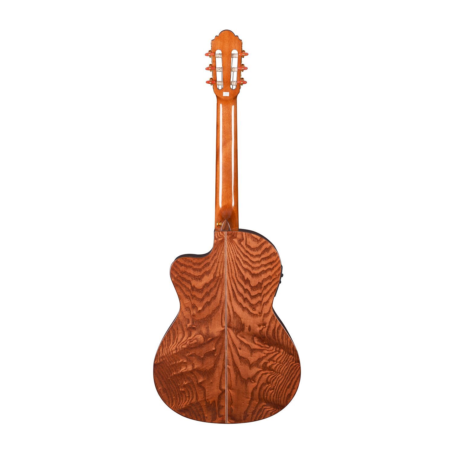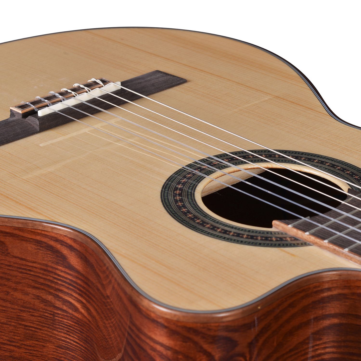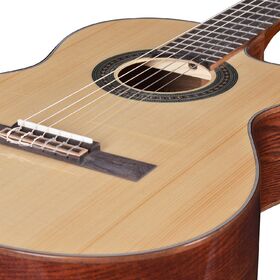 The Artist CS180CEQ is a great quality solid top classical guitar. The top is solid spruce while the back and sides are nicely figured ash laminate. The Spruce top will provide a bright and punchy tone that really cuts through and because it has a solid wood soundboard the guitar will only get better as the timber ages!