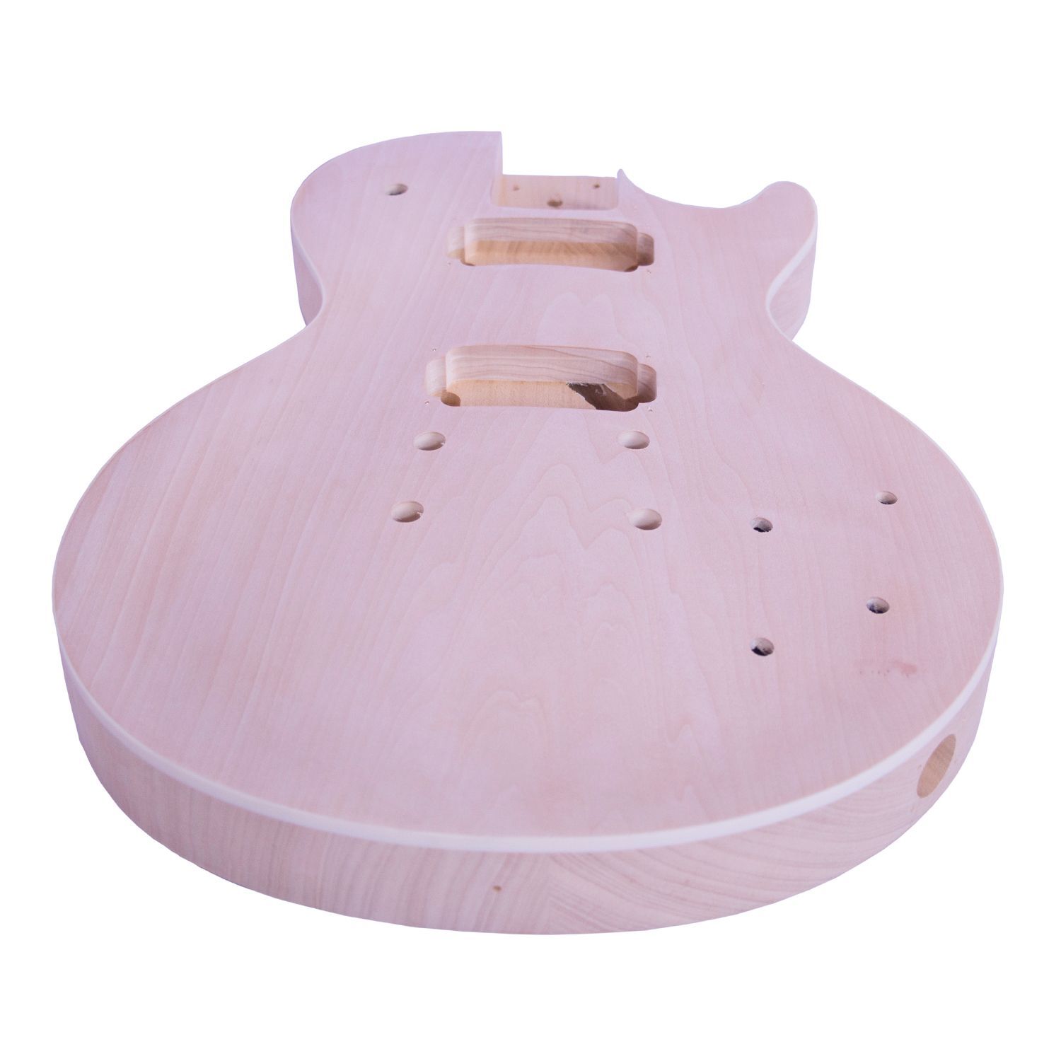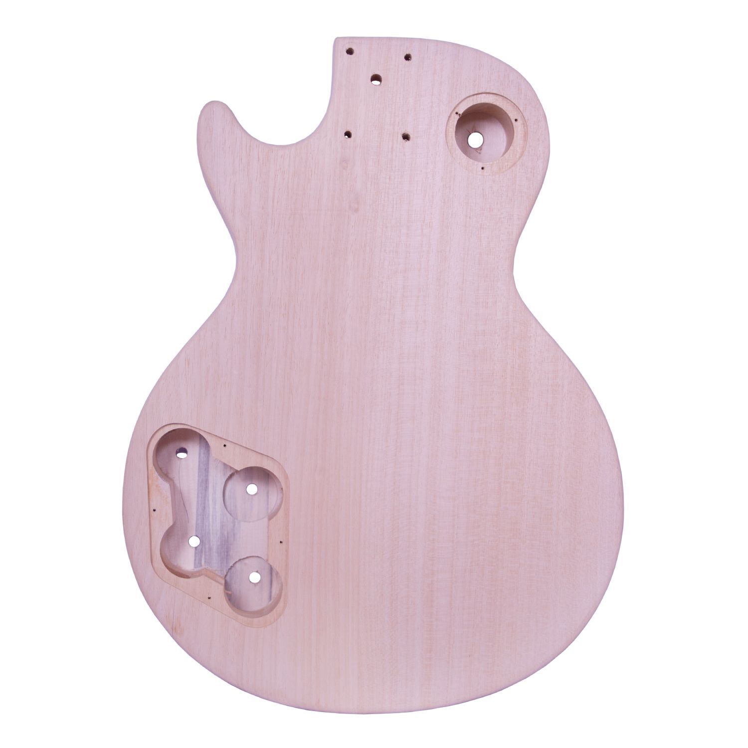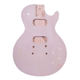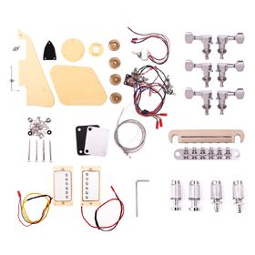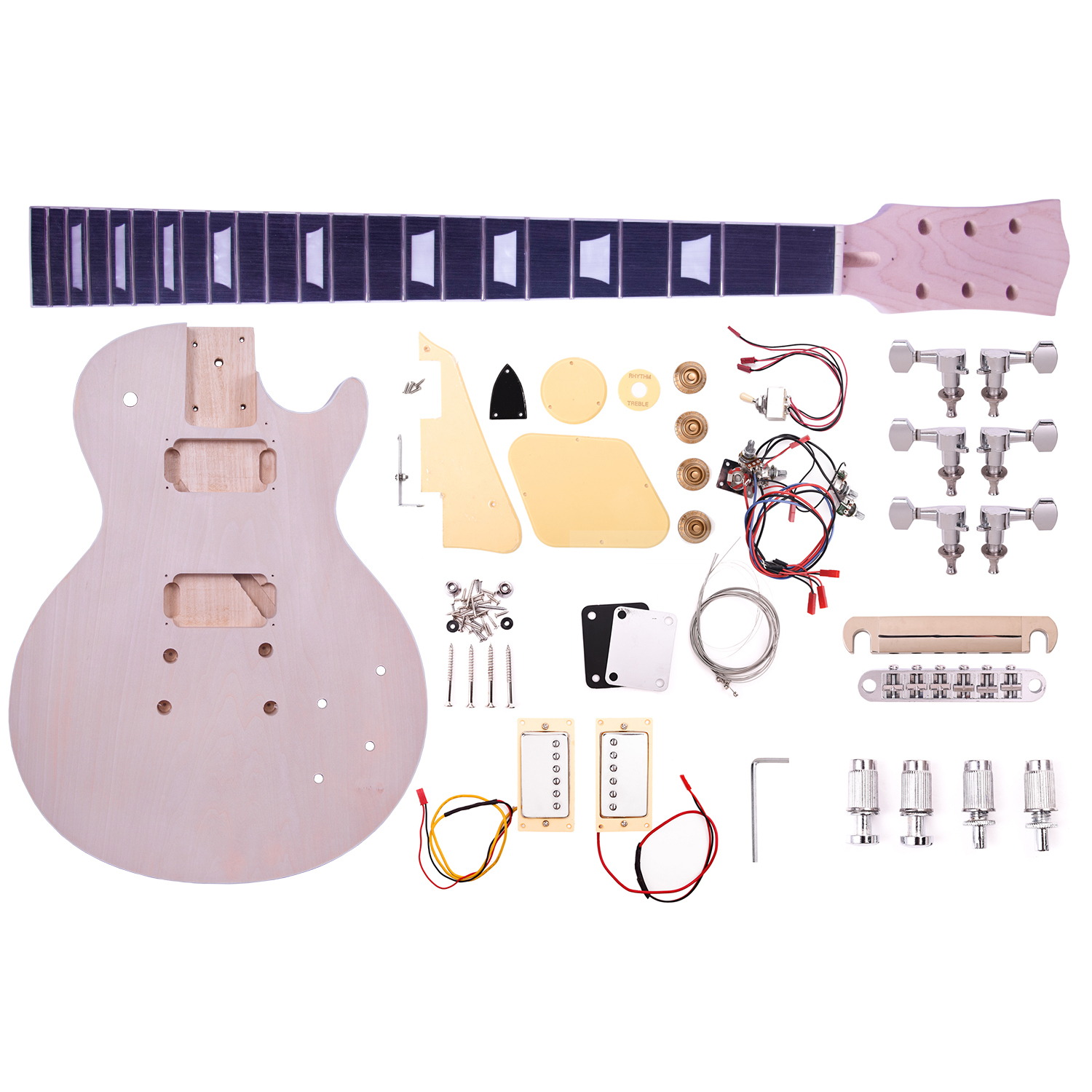 They include Ready-to-spray unbound bolt-on-neck, unbound and unfinished body, two humbuckers,cream scratch plate, cream back plates, pots, gold coloured knobs, chrome plated tunomatic bridge, Stop-Tail and strings. The kit features Rawwood without base paint or coating which allows you to do the stain or paint as you would want.