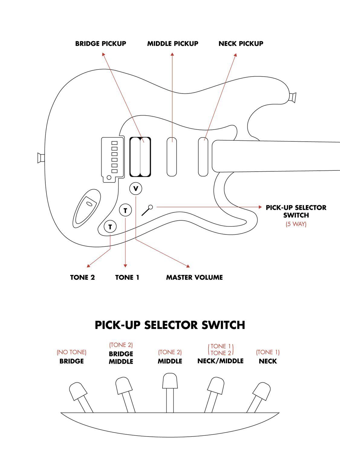 Controls: Volume, 2x Tone and 5 way switch for 5 different pickup combinations